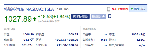 6月30日晚间消息,特斯拉股价盘中创历史新高,现涨近2%,市值一度突破1900亿美元。