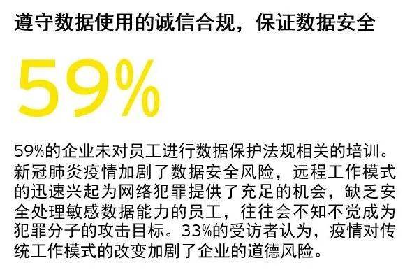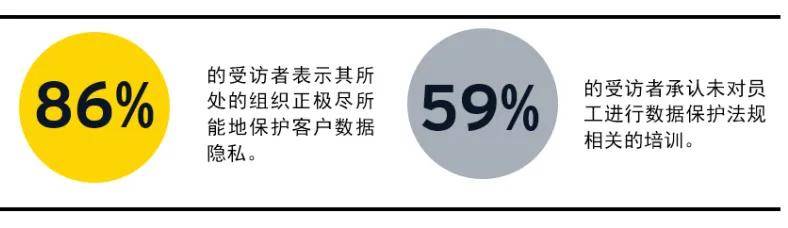 调研结果显示,公司对自己的数据保护政策过度自信,全球范围内有86%的受访者(在中国这一比例高达93%)表示其所处的企业正极尽所能地保护客户数据隐私。尽管如此,有59%的受访者(在中国这一比例为50%)承认未对员工进行数据保护法规相关的培训。