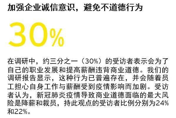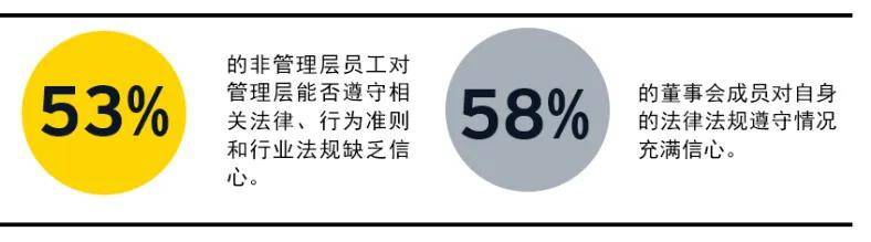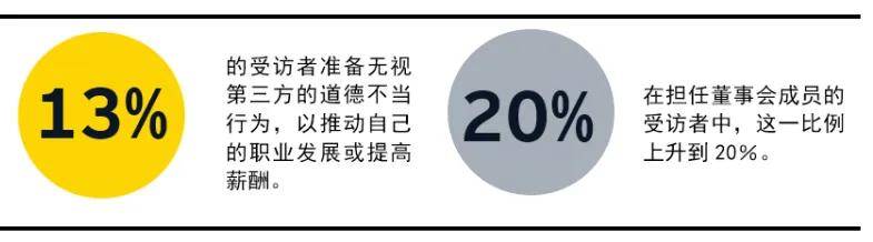 即使在新冠肺炎疫情爆发之前,大多数(53%)的非管理层员工对管理层能否遵守相关法律、行为准则和行业法规就缺乏信心。此外,13%的受访者似乎准备无视第三方的道德不当行为,以推动自己的职业发展或提高薪酬。而在担任董事会成员的受访者中,这一比例上升到20%。