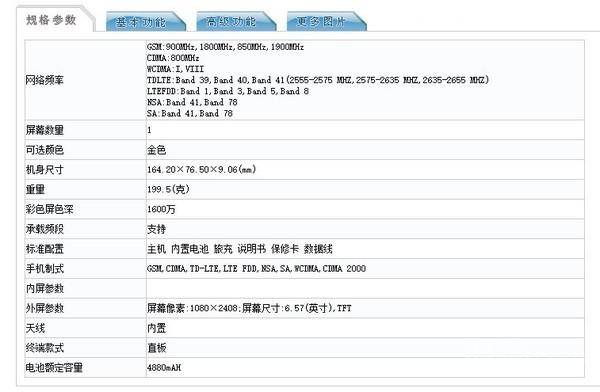 而根据工信部公布的该机的核心配置看,其机身三围分别为164.20×76.50×9.06mm,重量为199.5g;屏幕尺寸为6.57英寸,像素为1080×2408;电池额定容量为4880mAh,典型值可能为5000mAh;CPU主频为2.4GHz,爆料称这款手机可能搭载了天玑800芯片,有6GB/8GB两种运存和64GB/128GB/256GB三种内存版本可选;前置摄像头像素为1600万,后置4800万+200万+200万像素三摄像头。
