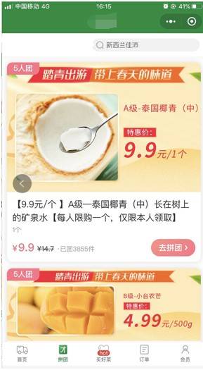 借助拼团插件,超市可推出“团购享优惠”活动。比如原价14.7元椰青,5人团购价9.9元。此时,若有客户准备下单,通常是有很大几率会去邀请好友一起下单的。这样一来,就能同时卖出多份产品,因此能够大大提升自己的收益。