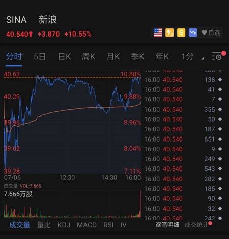 受私有化消息影响,7月6日晚间美股开盘后,新浪股价大涨,截至收盘,新浪股价40.54美元,涨10.55%,总市值26.51亿美元。受相关消息利好拉动,新浪子公司微博(WB)收盘价39.78美元,涨17.97%,总市值90.09亿美元。