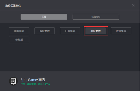 接着下载奇游加速器,加速 “Epic Games商店”,选择美服: