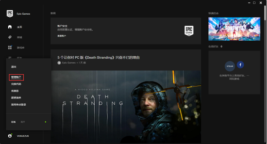 首先,将你的EPIC账号切换至美国地区,点击左下角个人ID,点击管理账户:
