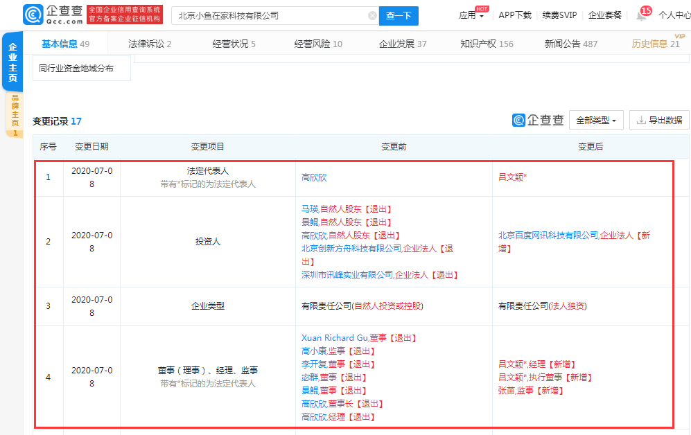 新京报贝壳财经讯 企查查显示,北京小鱼在家科技有限公司日前发生工商变更,高欣欣、马瑛在内的5位投资人全部退出,新增北京百度网讯科技有限公司为投资人。此外,包括李开复在内的6位高管全部卸任,其中,高欣欣卸任法定代表人、经理、董事长,新增吕文颖为法定代表人、经理、执行董事;新增张苗为监事;企业类型也从有限责任公司(自然人投资或控股)变更为有限责任公司(法人独资)。