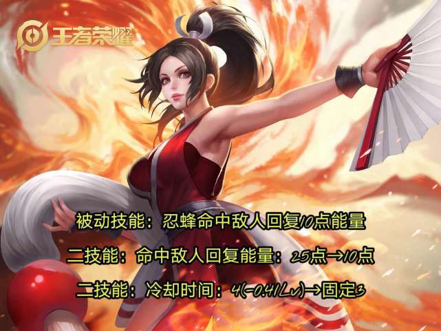 而正式服火舞调整内容为被动技能增加效果:忍蜂命中敌人回复10点能量;二技能:命中敌人回复能量由25点调整为10点,同时冷却时间由4(-0.4/Lv)固定为3秒,同时调整底层机制使得技能的施法过程更加稳定。简言之,后期火舞2技能延长,所以依赖二技能消耗的火舞后期确实不如之前版本强势了。