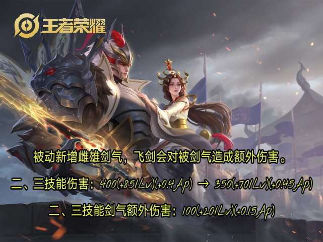 我们看一下干将莫邪的具体调整内容,被动新增效果:雌雄剑命中敌方目标会分别叠加雌雄剑气,飞剑会对被剑气缠绕的目标造成额外伤害。同一道剑气被同时多次激发时,后续只造成50%伤害。二、三技能伤害由400(+85/Lv)(+0.4Ap) 调整为 350(+70/Lv)(+0.45Ap),二、三技能新增剑气额外伤害100(+20/Lv)(+0.15Ap)!