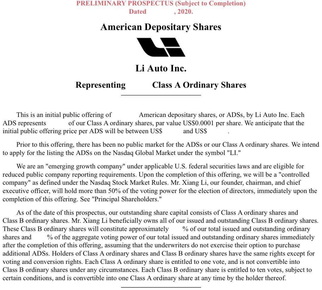 北京时间7月11日凌晨,国内新造车公司理想汽车正式向美国证券交易委员会(SEC)递交了IPO文件。理想汽车计划在纳斯达克上市,股票代码为“LI.”,将发行A类及B类股票,拟最高融资1亿美元(约合人民币7亿元)。