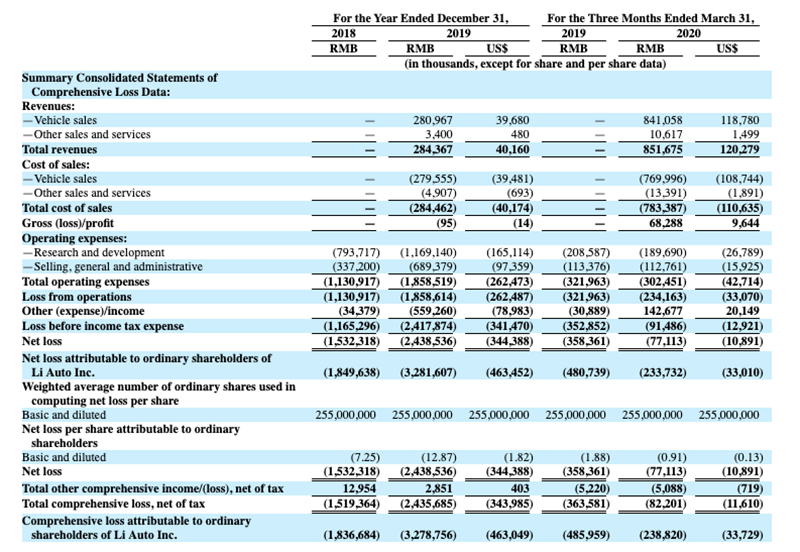 营收方面,IPO文件显示,从2018年至2020年的第一季度,理想汽车一直处于净亏损状态。2018年,理想汽车净亏损人民币15.32亿元;2019年,理想汽车的运营收入为2.84亿元,净亏损24.38亿元;2020年第一季度,运营收入8.51亿元,净亏损是7711万元。换句话说,从2018年至2020年第一季度,理想汽车一共亏损了约40.47亿元人民币。