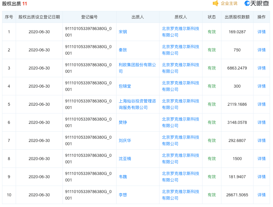 此外,在赴美上市前夕,理想汽车突然出现股东集体出质股权的情况。天眼查显示,6月30日,理想汽车的运营主体北京车和家信息技术有限公司新增11条股权出质信息,11位股东全部出质股权,质权人为北京罗克维尔斯科技有限公司。对此,理想汽车官方表示:“不予置评”。