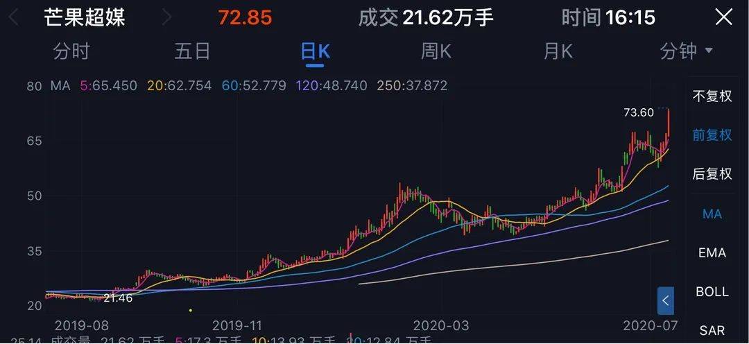 在过去一年,芒果超媒在传统影视传媒板块大跌的情况下,股价由21元/股左右开始屡创新高,最新收盘价已经达到73元/股,一年涨幅250%;较年初的35元/股,也已翻倍。
