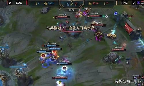 拿下男爵后,RNG开始了中下分推,EDG选择在下路抓猴子,正面的中路高地却白给了,RNG正面四人直接破高。随后在高地团战中获胜后,RNG一波结束比赛,获得第一把比赛的胜利。