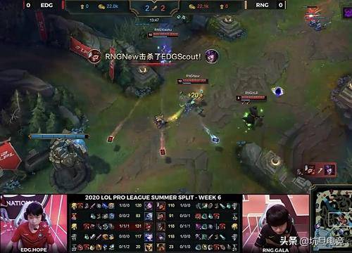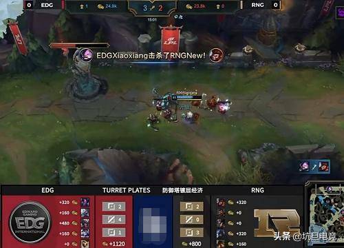 眼看RNG拿到了优势,但14分钟,EDG在下路抓了一波,Xiaohu被迫TP支援过来保护,结果自己的中一塔被Scout推掉送出一血塔,随后上路Xiaoxiang越塔单杀New,RNG上一塔随后也告破。
