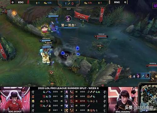 比赛刚开始RNG就三人入侵到了 EDG蓝区,成功抢走了蓝BUFF。随后XLB又在三狼处赶走了Junjia,导致后者前期节奏大乱。3分钟时,Xiaohu又到了下路绕后gank,逼出了EDG下路两个召唤师技能。6分钟时Xiaohu在河道排眼,结果被EDG这边中野辅抓住机会一套技能将其带走,一血被Scout拿了下来。