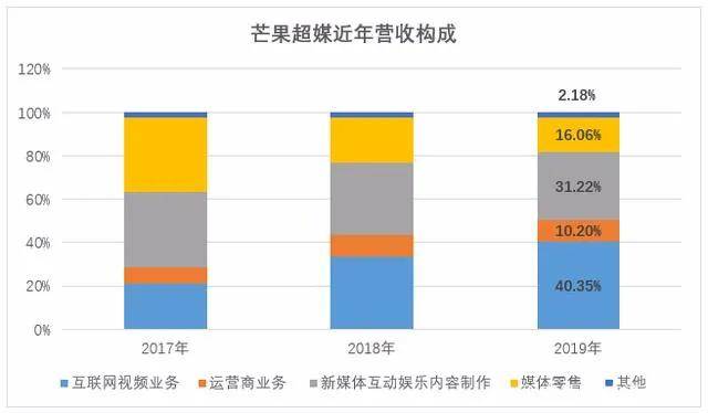 根据今年一季报,芒果超媒的主营业务包括新媒体平台运营、新媒体互动娱乐内容制作、媒体零售及其他,新媒体平台运营又包括互联网视频业务和运营商综合业务。