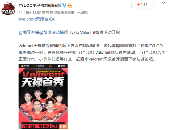 为了庆祝TYLOO战队的Valorant分部加入虎牙首秀,虎牙平台也是准备了一系列的预热活动,他们在官方微博上发布了首播公告,转发微博就能够获得京东卡。而在7月10日至7月15日期间,大家参与微博话题“#Valorant天禄首秀”,就有机会获得战队的精美周边,并且在Valorant天禄首秀当日,和职业战队进行正面对决。相信很多TYLOO俱乐部的粉丝们,已经迫不及待参与其中。