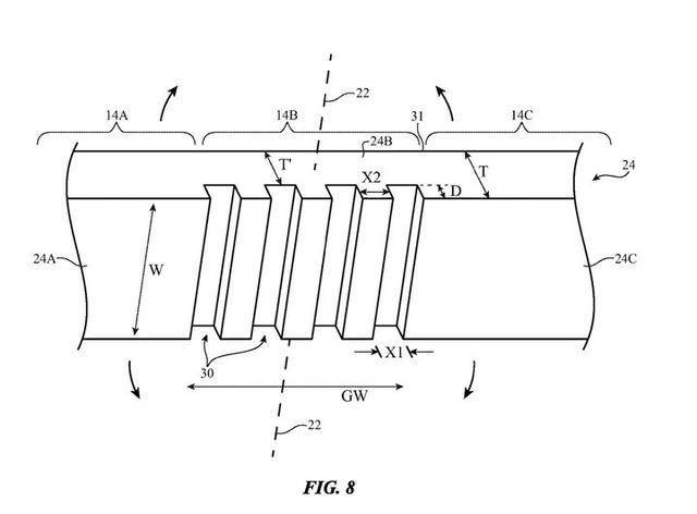 根据苹果的专利图来看,苹果希望能够在柔性屏幕折叠处的里侧切割出一系列凹槽,并使用和屏幕原材质折射率相同的弹性聚合物或液体填充凹槽。简单来说,当我们合上折叠屏手机的时候,这一填充物会被压缩在其中,而展开时则会膨胀开来,覆盖在凹槽处,不会产生折痕等影响。