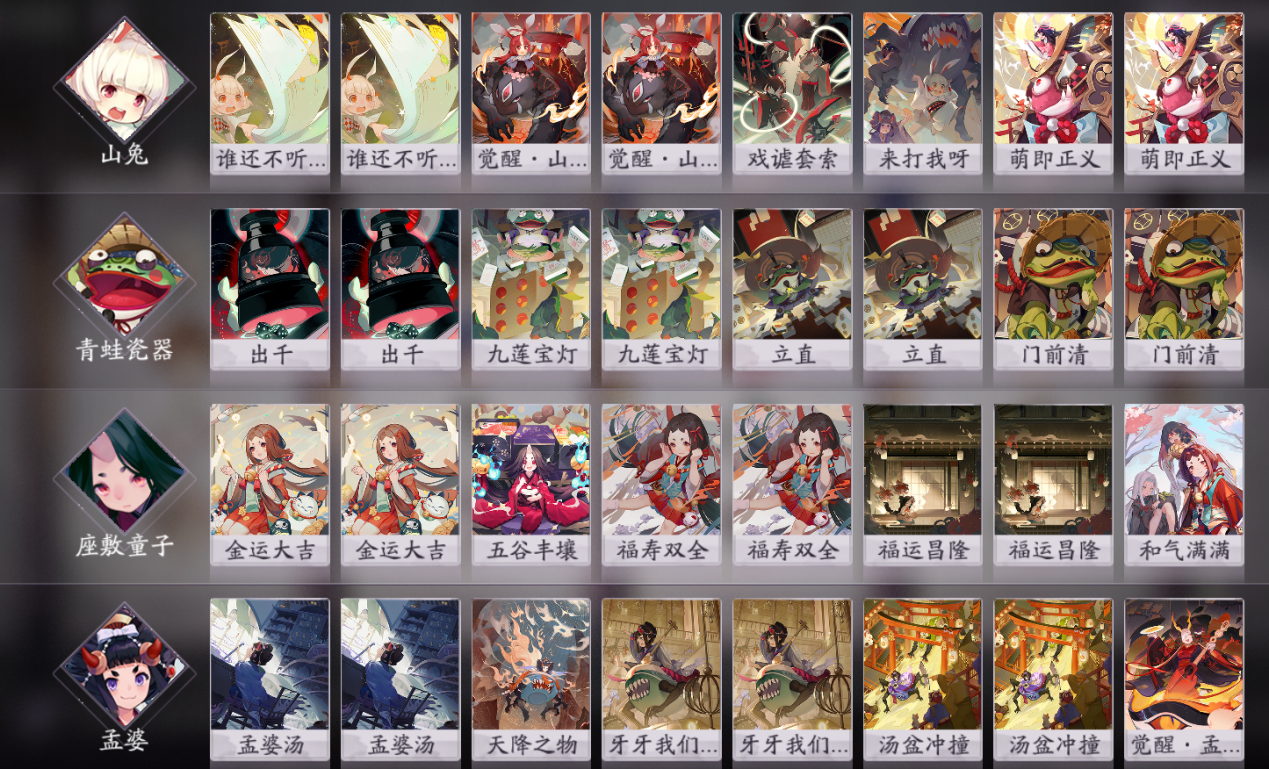 山兔、青蛙瓷器、座敷童子,这三位典型的运势式神,也能与孟婆组成一套娱乐性较强的卡组。孟婆的作用是在撕牌的同时触发增益效果,以打出更高的爆发伤害;座敷童子利用形态来保护牌手,过牌与提供鬼火;青蛙瓷器补充了孟婆的不足,“门前清”与“九莲宝灯”分别是运势卡组重要的盾与矛;山兔则提供了补刀、单解法术,后期还能让队友减少复活时间,增强队友的输出能力。