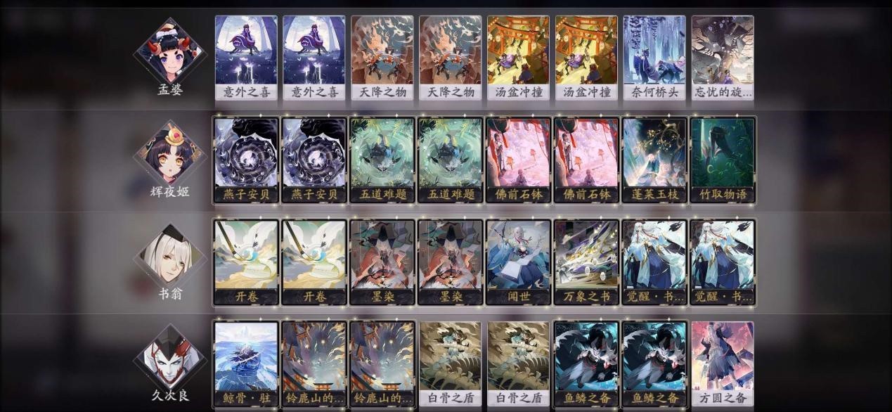 书翁作为优秀的过牌式神,可以提供精准的定向单解。加上孟婆的过牌与撕牌能力,让我方的手牌资源更为丰富,且能压制对手的资源获得优势。久次良的法术与形态牌则提供站场与保护,在辉夜姬幻境的加持下还可以保护友方式神。辉夜姬的“五道难题”用于定向获取幻境,“蓬莱玉枝”是最重要的一张幻境牌,触发特效后每个回合都能额外过两张牌,使书翁迅速觉醒。