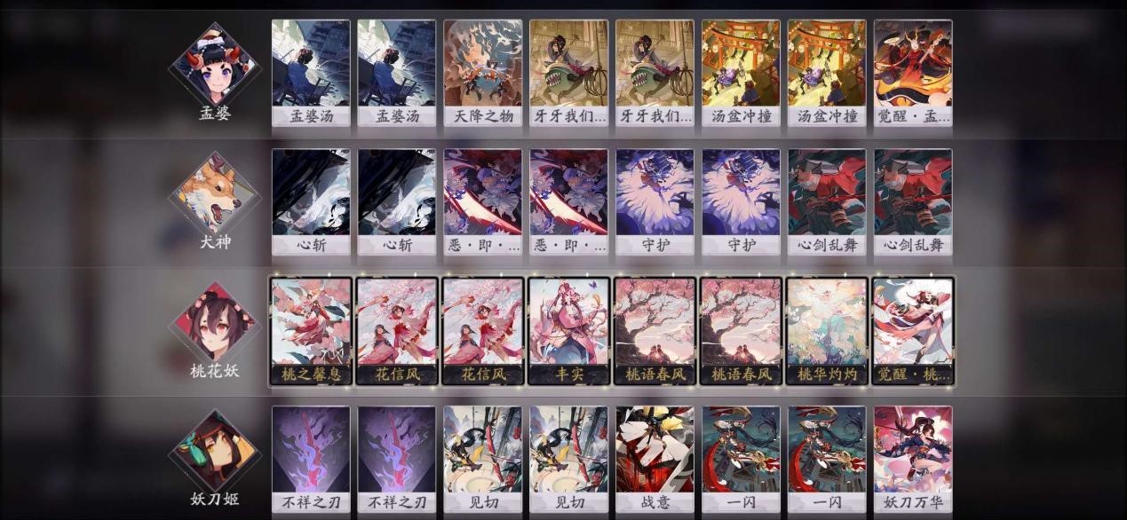 孟婆、犬神、桃花妖与妖刀姬的组合,每一张卡都是新手期较易获得且质量高而难度却不高的选择。在这套卡组中,孟婆利用法术来削减对手牌库数量,从而强化卡牌;犬神是战斗区的站场护盾,以及战士;妖刀姬通过战斗牌连击打出伤害,后期配合形态牌来斩杀对方牌手;桃花妖提供稳定的回复与增益,与犬神是经典搭配。对手牌库的消耗一方面折损了资源,另一方面也会打乱敌方的输出节奏,使之很难进入后期阶段。