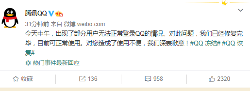 7月15日,针对部分QQ用户反映的无法登录情况,@腾讯QQ 官方微博回应称,“今天中午,出现了部分用户无法正常登录QQ的情况。对此问题,我们已经修复完毕,目前可正常使用。对您造成了使用不便,我们深表歉意!”