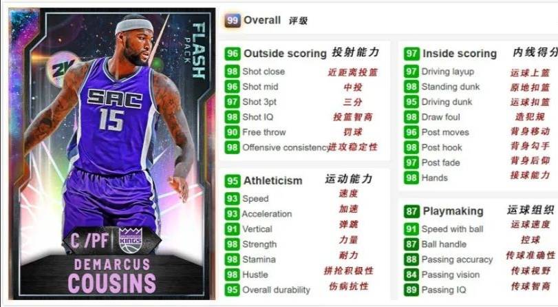 从性价比等综合方面而言,国王时期的巅峰考辛斯或许是此次最贴地气的球员。但凡看球的都知道,国王时期的考神绝对是联盟中的内线大杀器,后来因为伤病原因,导致考神在游戏中的风头也被新秀波尔津吉斯抢了不少。此外,在游戏对于模型的要求越来越高之后,考辛斯210cm的身高也有点不太够用了。