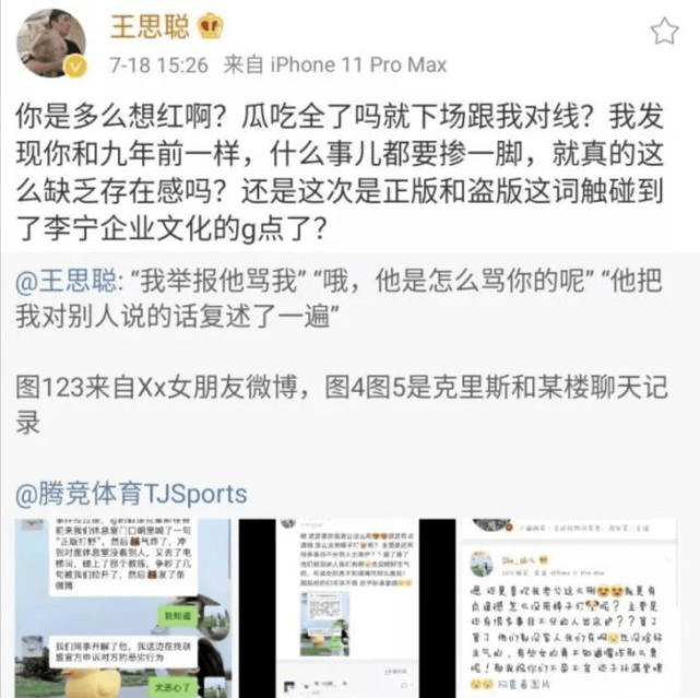 王思聪一向怼人怼得狠,面对LNG的老板也丝毫不留情面,直接怒怼LNG老板什么事儿都要插一脚,跟几年前一模一样,还暗讽起了LNG的企业文化,用最近两队之间起摩擦的正版盗版梗,反问难道这就是LNG的企业文化吗?