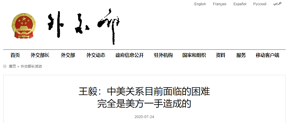2020年7月24日,国务委员兼外长王毅同德国外长马斯举行视频会晤时,应询介绍了当下的中美关系。