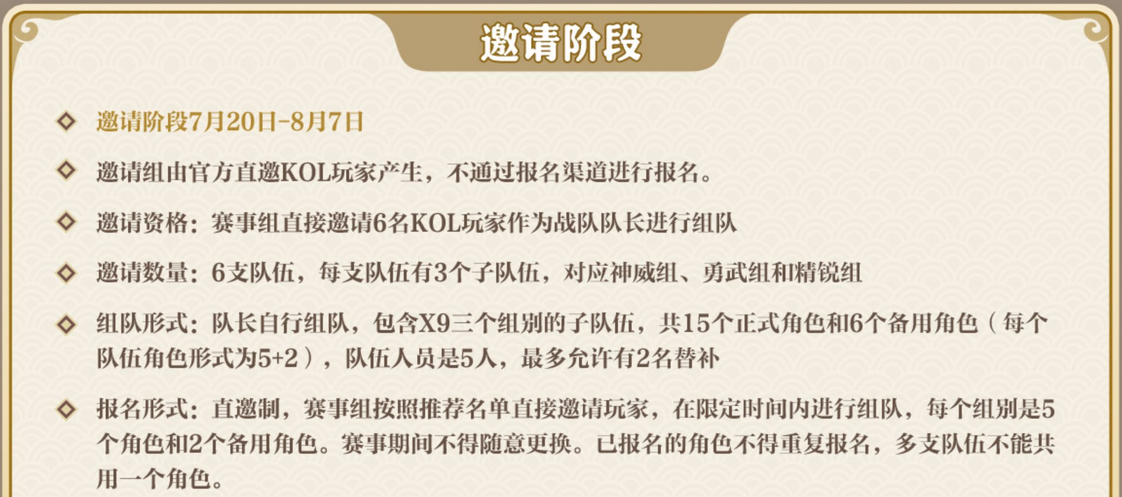 这次赛事由民间间接约请六名KOL玩家作为战队队出息行组队,这6名玩家将调集本人的摰友各自组成六支步队,每一支步队又分为三个子步队,辨别正在神威、勇武、精锐三年夜组别中对战。