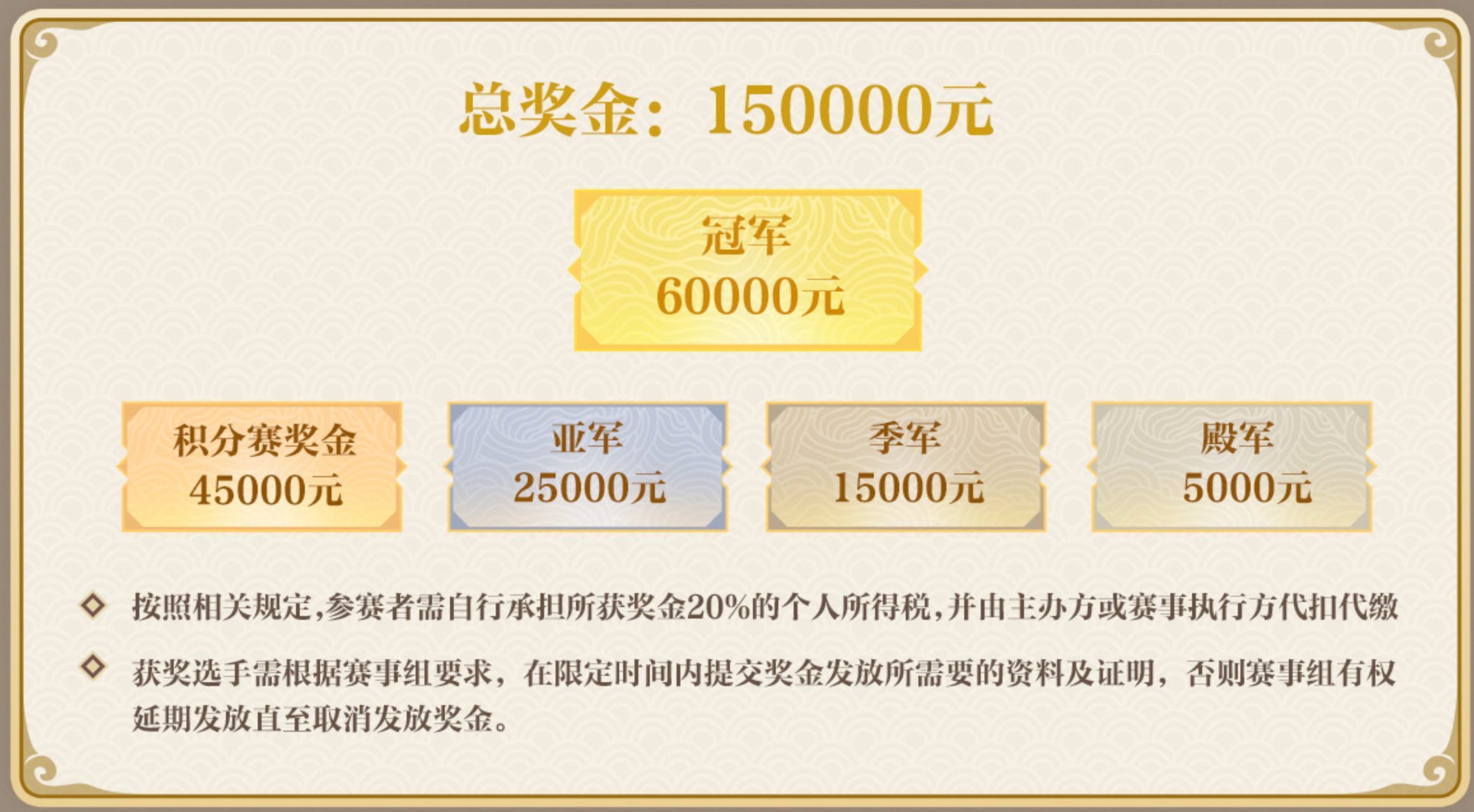 此中,冠军战队将独享60000群众币现金处分。亚军、季军、殿军战队也将辨别取得25000、15000、5000群众币现金回馈。正在积分赛阶段,但组别步队取得一场较量成功,便可间接博得1000成功奖金。