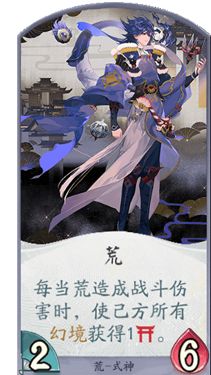 荒是百闻牌中经典的幻景式神之一,他正在卡组中表演着战役法师的身份,经过自毁幻景的形式,取得爆炸式的高输入。荒制作战役损伤时,可以让己方的一切幻景都取得持久,以是他也是一名非常适宜与幻景卡组搭配的式神。
