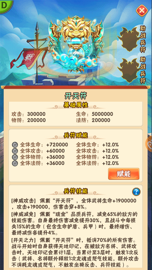 开天符举动前便可回复佩带武将/名将4点龙魂,这保障了少年们的输入节拍,同时,四级解控抑制当下除了了琉金武将外的一切减益,浑沌护体则可提供弱小的锁血维护机制。别的,开天符领有特征出击管制,少年们只要搭合营理的阵容,可迅速瓦解敌方。赋能层面,武将名将各有偏重,玩家能够依据本身阵容,抉择合适的强化门路。
