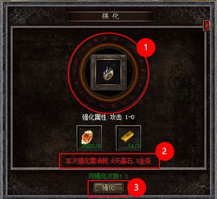 装备强化除了需要沃玛以上装备外,还需要消耗通过【烟火屠魔】获得的天晶石。 装备级别不同,强化次数也不相同。沃玛装备只能够强化1次,祖玛装备能够 3次,作为现版本最高级别的赤月装备则是能够强化5次。每次强化都有几率增加装备属性,也有可能强化失败,每次强化不论强化结果,都将消耗强化次数1次,所以请各位玩家谨慎选择是否强化。