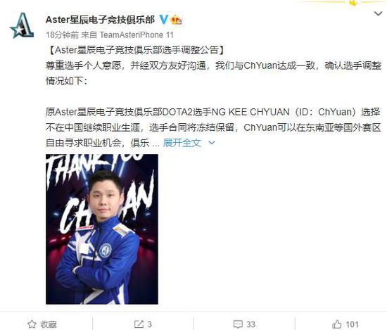 原Aster星辰电子竞技俱乐部DOTA2选手NG KEE CHYUAN(ID:ChYuan)选择不在中国继续职业生涯,选手合同将冻结保留,ChYuan可以在东南亚等国外赛区自由寻求职业机会,俱乐部在此支持他的选择,同时也会尽全力帮助他。