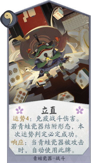 作为一位赌鬼,田鸡磁器十分擅长“出千”,能够正在每一次战役时取得护甲加成。经过“转运”,他能够断定一次,胜利即随机弃掉两张手牌并再次攻打。当田鸡磁器“立直”,他的防御会免疫战役损伤,这张牌另有呼应成果。
