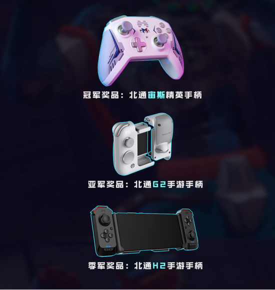赛场上拼尽全力的玩家们除了获得了胜利的喜悦外,同时也获得了由北通所提供的,北通宙斯精英手柄、北通G2手游手柄、北通H2手游手柄等丰厚的奖品。