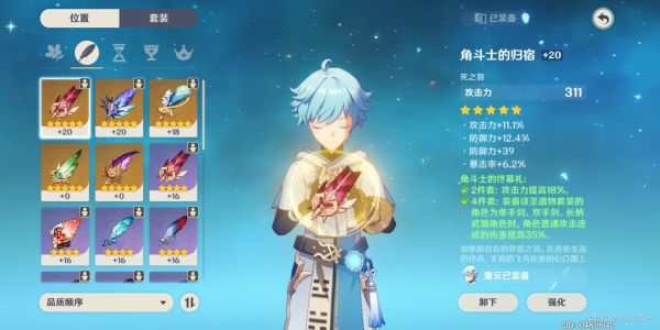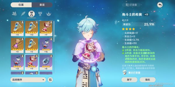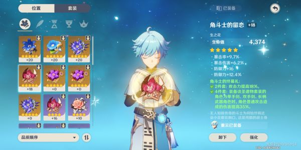 圣遗物这边是用的角斗士4件,增加普攻的伤害。因为主C就是人群中劈砍嘛,普攻伤害占有很大的比例。