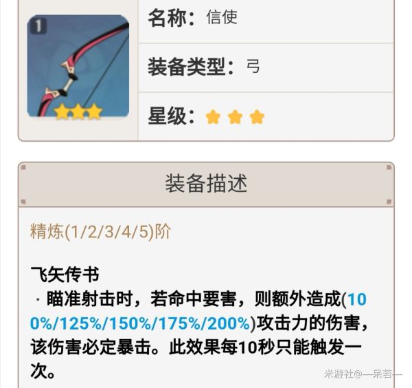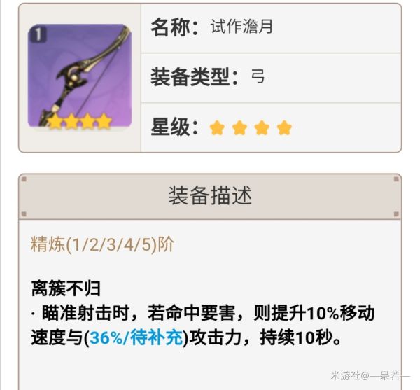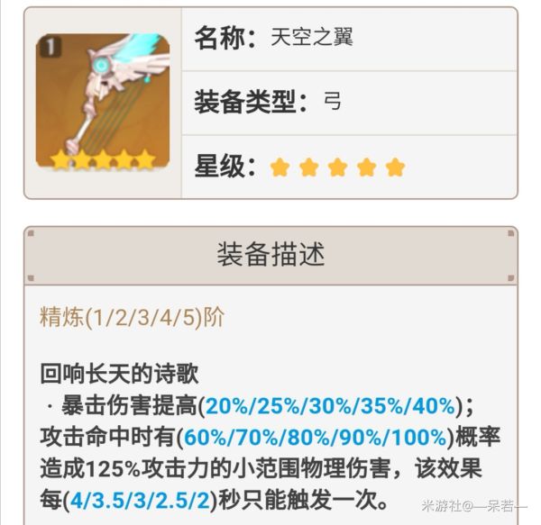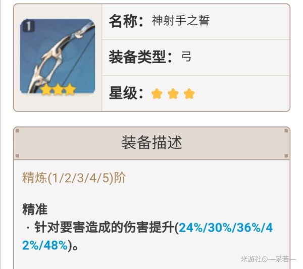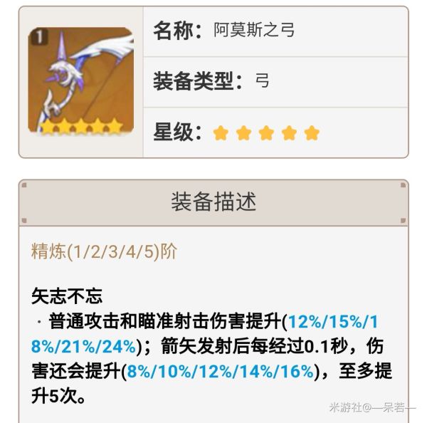 双攻击面板,攻击面板怪物,人称痛苦之弓,由于输出条件比较苛刻(拉扯战里要熟练掌握距离才能打出高爆发),风评不是很高,属于中下五星武器,但对瞄准流安柏绝对是最佳武器。由于高面板,即使不打元素反应的要害攻击也能造成超高的伤害,上限非常高,练满以后对安柏绝对是质变。