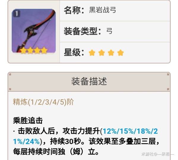 副属性是优秀的爆伤属性,技能也简单粗暴,打要害提升伤害,精炼容易(抽卡一抽一仓库),在前中期有不输于一阶五星武器阿莫斯之弓的伤害,还是比较建议使用的武器,练到60-70级最佳,往后会输在低星武器面板低的硬伤上。