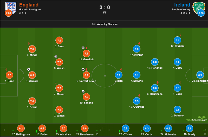 英格兰(3-4-3):1-波普(46’迪恩-亨德森)、5-马奎尔、6-明斯(61’梅特兰-奈尔斯)、4-迈克尔-基恩、3-萨卡、2-里斯-詹姆斯、8-温克斯、7-芒特(73’贝林厄姆)、11-格拉利什(61’福登)、10-桑乔、9-卡尔沃特-勒温(63’亚伯拉罕)