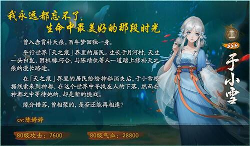 在本次联动活动中,全新SSR妖灵于小雪和SR妖灵幻海·阿缈携手亮相。前者是《轩辕剑天之痕》的第一女主角,她的温柔、勇敢和善良曾给降妖师们留下了深刻印象。随着于小雪从传说中走出,来到降妖师们的身旁,想必也能让你对她产生更生动全面的了解。后者是人气SR妖灵阿缈的全新形态,是阿缈为了感悟某位同族的所思所想而变幻出她的样子。在沙海边,幻海·阿缈不断的追索着自由与生命的真谛。