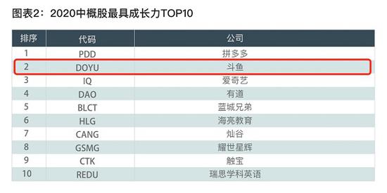 斗鱼于2019年7月在美国纳斯达克上市,是国内为数不多的专注游戏直播赛道的互联网企业,为超过3亿年轻互联网用户提供高清、实时互动的游戏、电竞、泛娱乐直播服务。此次入选“2020中概股最具成长力TOP10”,表明斗鱼上市以来的财务数据增长幅度、业务数据增长幅度、声誉、行业及公司潜力,均已获得业内知名财经媒体及券商平台的高度认可。