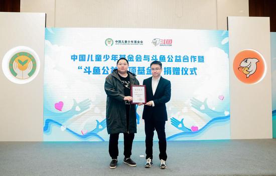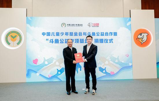 斗鱼创始人兼CEO陈少杰代表斗鱼,向中国儿童少年基金会捐赠首笔善款300万元,成立“中国儿童少年基金会斗鱼公益专项基金”。该基金将用于儿基会自有品牌公益项目,包括但不限于“护航计划”、“鹰翔计划”等资助青少年儿童健康成长的公益项目,还将用于双方未来共同探索的创新公益项目,善款捐赠支出均从专项基金中扣除。同时,刘谋作为斗鱼的杰出主播代表,也被授予“斗鱼青少年公益倡导人”荣誉称号,以表彰他一直以来为公益事业的默默付出。