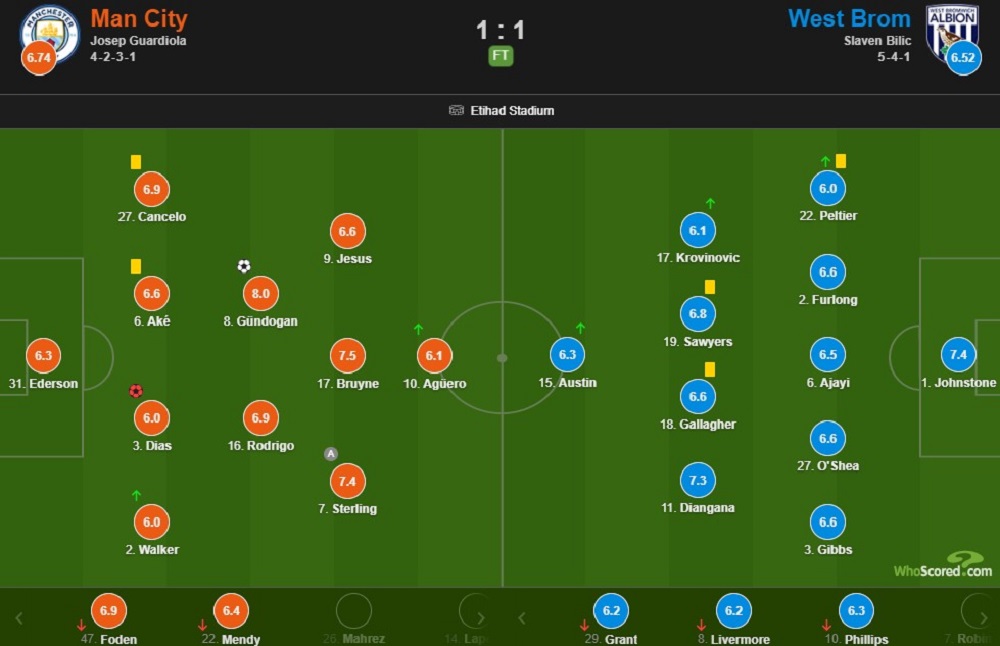 半场战罢,曼城主场暂时1-1与西布罗姆维奇战成平局。