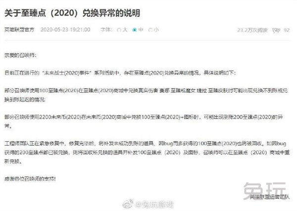 工程师团队正在紧急修复中,修复完毕后,将补发未成功到账的道具,因bug而多获得的100至臻点(2020)也将被回收。如因bug获得的200至臻点都已被兑换,则将回收所兑换的道具并补发100至臻点(2020)及图标,召唤师可以在至臻点(2020)商城中重新兑换。