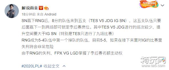 SN赢下RNG后,8分的队伍来到五支(TES V5 JDG IG SN),这五支队伍只要后面赢下一到两场即可锁定季后赛席位。其中TES V5 JDG进行的场次较少,提升空间要大于IG SN(特别是TES只进行了九场比赛)RNG成为5-4队伍中第一个掉队的队伍,目前5-5,如果在接下来面对IG的比赛里失利将会非常危险由于RNG的失利,FPX VG LGD掌握了季后赛名额主动权
