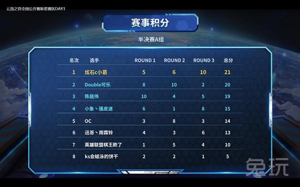 半决赛A组的3场比赛已全部打完,积分前四能够晋级的分别是:炫石c小葛,Double可乐,陈庭伟以及小象丶骚皮迷。让我们恭喜他们四位选手成功晋级,一起期待他们在新星赛区决赛中的精彩表现!