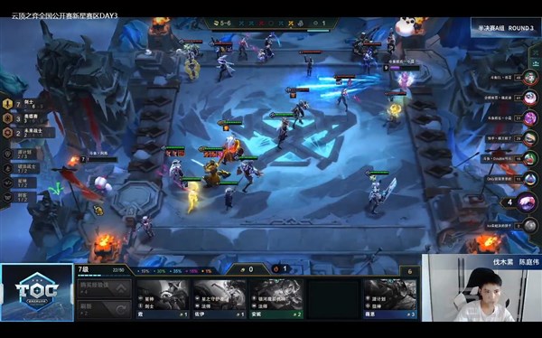 来自“伐木累”的陈庭伟选手在前期依靠合理的装备分配,以及较高的棋子质量,一路连胜保持良好的经济,为阵容选择留下了更多的空间。