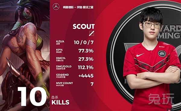 自从前几场比赛开始,EDG的中单选手Scout就经常能够打出既稳定有Carry的表现。而在第二场比赛中,当面对对手没有位移的双C时,Scout的一手中单阿卡丽打出了“杀疯了”的效果。在这一场近乎于碾压的比赛中,Scout再一次向我们证明了EDG的皇牌选手到底是怎样的。